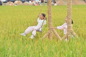 (251101) — GUANGXI, 1 noviembre, 2025 (Xinhua) — Niñas juegan en un campo, en la aldea de Silang de Liuzhou, en la región autónoma zhuang de Guangxi, en el sur de China, el 1 de noviembre de 2025. (Xinhua/Huang Xiaobang) (oa) (da)