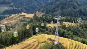 (251022) -- LONGSHENG, 22 octubre, 2025 (Xinhua) -- Imagen tomada con un dron el 22 de octubre de 2025 de turistas viajando en un teleférico para disfrutar del paisaje de las Terrazas de Arroz de Longji, en el distrito de Longsheng, en la región autónoma de la etnia zhuang de Guangxi, en el sur de China. (Xinhua/Pan Zhixiang) (ah) (ra) (ce)