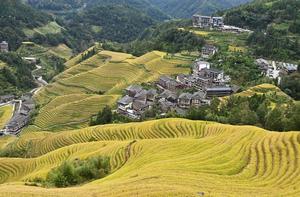 (251022) -- LONGSHENG, 22 octubre, 2025 (Xinhua) -- Imagen del 22 de octubre de 2025 de las Terrazas de Arroz de Longji y una aldea entre las terrazas, en el distrito de Longsheng, en la región autónoma de la etnia zhuang de Guangxi, en el sur de China. (Xinhua/Lu Boan) (ah) (ra) (ce)