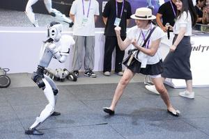 (250919) -- NANNING, 19 septiembre, 2025 (Xinhua) -- Un robot humanoide boxea con una visitante en el Centro Internacional de Convenciones y Exposiciones de Nanning, en Nanning, capital de la región autónoma de la etnia zhuang de Guangxi, en el sur de China, el 19 de septiembre de 2025. Productos que incorporan tecnologías de vanguardia, como la inteligencia artificial, la economía de baja altitud y los robots humanoides son exhibidos durante la 22ª Exposición China-ASEAN que se celebra actualmente. (Xinhua/Zhou Tinglu) (jg) (da) (vf)