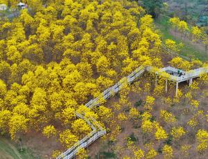 (250314) -- NANNING, 14 marzo, 2025 (Xinhua) -- Vista aérea tomada con un dron el 14 de marzo de 2025 de flores de Tabebuia chrysantha en el área escénica de la montaña Qingxiu, en Nanning, en la región autónoma zhuang de Guangxi, en el sur de China. (Xinhua/Zhou Hua) (jg) (da) (ce)