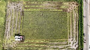 (250702) -- QINZHOU, 2 julio, 2025 (Xinhua) -- Vista aérea del 2 de julio de 2025 de una cosechadora recolectando arroz, en la aldea de Banping, en el poblado de Kangxiling de la ciudad de Qinzhou, en la región autónoma de la etnia zhuang de Guangxi, en sur de China. La cosecha temprana de arroz está en pleno apogeo aquí. (Xinhua/Zhang Ailin) (ra) (vf)