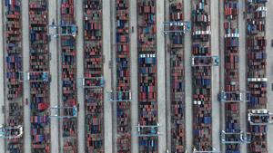 (250305) -- QINZHOU, 5 marzo, 2025 (Xinhua) -- Imagen aérea del 4 de marzo de 2025 de un patio de contenedores en una terminal de contenedores automatizada del Puerto de Qinzhou, en Qinzhou, en la región autónoma de la etnia zhuang de Guangxi, en el sur de China. El Nuevo Corredor Comercial Internacional Tierra-Mar, una red logística clave que conecta las regiones occidentales de China con los mercados globales, ha transportado 209.000 unidades equivalentes a veinte pies (TEU, por sus siglas en inglés) a través del servicio intermodal ferroviario-marítimo en los primeros dos meses de este año, de acuerdo con China Railway Nanning Group. Este volumen ya ha superado el total de 2019, lo que marca un aumento interanual del 58,4 por ciento, dijo el grupo ferroviario. (Xinhua/Zhang Ailin) (jg) (ah) (vf)