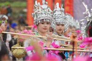 (250205) — LIUZHOU, 5 febrero, 2025 (Xinhua) — Mujeres del grupo étnico miao realizan una presentación folclórica durante el festival de Lusheng «Bainiaoyi», en el municipio de Gandong en el distrito autónomo miao de Rongshui de Liuzhou, en la región autónoma de la etnia zhuang de Guangxi, en el sur de China. Durante el festival de Lusheng «Bainiaoyi», un festival tradicional que se celebra anualmente en el municipio de Gandong, personas de diferentes grupos étnicos se reúnen para demostrar atuendos étnicos tradicionales, tocar Lusheng, un instrumento de viento tradicional de caña, y realizar bailes tradicionales. (Xinhua/Huang Xiaobang) (ah) (ra) (vf)