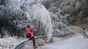 (260121) -- SANJIANG, 21 enero, 2026 (Xinhua) -- Un visitante toma fotografías de carámbanos, en el distrito autónomo dong de Sanjiang, en la región autónoma de la etnia zhuang de Guangxi, en el sur de China, el 21 de enero de 2026. (Xinhua/Zhang Ailin) (ah) (ra) (vf)