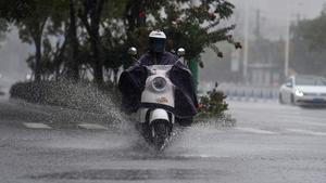(250614) -- BEIHAI, 14 junio, 2025 (Xinhua) -- Un ciudadano circula en medio de fuertes lluvias, en la ciudad de Beihai, en la región autónoma zhuang de Guangxi, en el sur de China. Múltiples autoridades chinas se reunieron el sábado para poner en marcha medidas de precaución frente al tifón Wutip, el primer tifón del año, que se espera traiga fuertes lluvias a las regiones meridionales del país. (Xinhua/Zhang Ailin) (oa) (da)