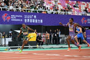 (250512) -- GUANGZHOU, 12 mayo, 2025 (Xinhua) -- Imagen del 11 de mayo de 2025 de Akani Simbine (i), del equipo de Sudáfrica, compitiendo durante la final de relevos 4x100m masculinos de los Relevos Mundiales de Atletismo de Guangzhou 2025, en Guangzhou, en la provincia de Guangdong, en el sur de China. (Xinhua/Song Yanhua) (rtg) (ah) (ce)