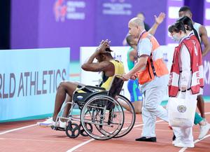 (250512) -- GUANGZHOU, 12 mayo, 2025 (Xinhua) -- Imagen del 11 de mayo de 2025 de Julian Forte (i), del equipo de Jamaica, reaccionando después de lesionarse durante la segunda ronda de clasificación de relevos 4x100m masculinos de los Relevos Mundiales de Atletismo de Guangzhou 2025, en Guangzhou, en la provincia de Guangdong, en el sur de China. (Xinhua/Lu Hanxin) (rtg) (ah) (ce)