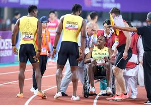 (250512) -- GUANGZHOU, 12 mayo, 2025 (Xinhua) -- Imagen del 11 de mayo de 2025 de Julian Forte (abajo), del equipo de Jamaica, reaccionando después de lesionarse durante la segunda ronda de clasificación de relevos 4x100m masculinos de los Relevos Mundiales de Atletismo de Guangzhou 2025, en Guangzhou, en la provincia de Guangdong, en el sur de China. (Xinhua/Lu Hanxin) (rtg) (ah) (ce)