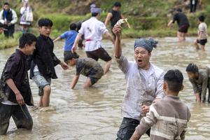 (250426) — CONGJIANG, 26 abril, 2025 (Xinhua) — Aldeanos participan en una actividad de captura de peces durante un evento cultural en campos aterrazados, en el distrito de Congjiang, en la provincia de Guizhou, en el suroeste de China, el 26 de abril de 2025. Una variedad de eventos culturales se llevaron a cabo aquí para mostrar la agricultura tradicional y los coloridos trajes étnicos locales. (Xinhua/Wu Dejun) (oa) (da)