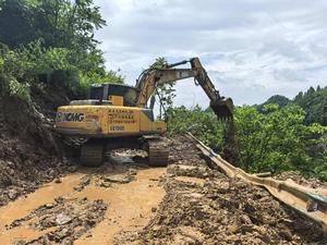 (250522) -- DAFANG, 22 mayo, 2025 (Xinhua) -- Una excavadora limpia carreteras, en la aldea de Qingyang, en el poblado de Guowa del distrito de Dafang, en la provincia de Guizhou, en el suroeste de China, el 22 de mayo de 2025. Dos deslizamientos de tierra distintos afectaron el jueves los poblados de Changshi y Guowa en el distrito de Dafang, en la provincia suroccidental china de Guizhou, dejando atrapadas a varias personas. Los deslizamientos ocurrieron alrededor de las 3:00 y las 9:00 horas del jueves. Dos personas quedaron atrapadas en Changshi, y otras más en la aldea Qingyang de Guowa. Las labores de rescate están en marcha. (Xinhua) (da) (ra) (vf)