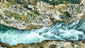 (250723) -- GUIYANG, 23 julio, 2025 (Xinhua) -- Vista aérea tomada con un dron el 21 de julio de 2025 de personas practicando rafting en botes inflables en el río Luobei, en el distrito de Guiding, en la provincia de Guizhou, en el suroeste de China. (Xinhua/Ou Dongqu) (ah) (ra) (vf)
