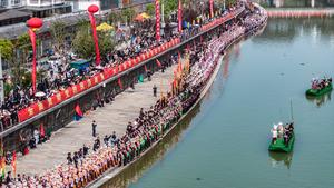 (250413) -- GUIYANG, 13 abril, 2025 (Xinhua) -- Vista aérea tomada con un dron el 13 de abril de 2025 de personas en trajes étnicos asistiendo a un evento de canto para celebrar el Festival de las Hermanas Miao, en el distrito de Taijiang, en la provincia de Guizhou, en el suroeste de China. El evento de canto se llevó a cabo aquí junto a un río el domingo, como parte de las celebraciones del Festival de las Hermanas Miao, un patrimonio cultural nacional inmaterial. (Xinhua/Tao Liang) (rtg) (ah)