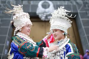 (250412) -- TAIJIANG, 12 abril, 2025 (Xinhua) -- Una mujer porta un traje étnico mientras ayuda a su compañera artista a ajustar los adornos de la cabeza durante una actividad para celebrar el Festival de las Hermanas Miao, en el distrito de Taijiang, en la provincia de Guizhou, en el suroeste de China, el 12 de abril de 2025. Reconocido como patrimonio cultural inmaterial nacional, el Festival de las Hermanas Miao se celebró aquí el sábado. (Xinhua/Liu Xu) (oa) (da)