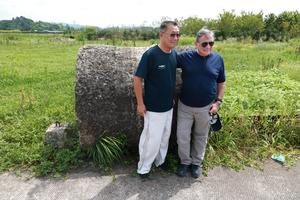(250718) — HUANGPING, 18 julio, 2025 (Xinhua) — Imagen del 16 de julio de 2025 de Jeffrey Greene (d) posando para una fotografía junto a un gran molino de piedra utilizado por los lugareños durante la construcción del aeropuerto, en el Aeropuerto de Jiuzhou del distrito de Huangping, en la prefectura autónoma miao y dong de Qiandongnan, en la provincia de Guizhou, en el suroeste de China. Del domingo al jueves, Greene, presidente de la Fundación del Patrimonio de la Aviación Sino-Estadounidense, encabezó una delegación a Guizhou, siguiendo los pasos históricos de los Tigres Voladores, conocidos como el Grupo de Voluntarios Estadounidenses de la Fuerza Aérea China, que fue fundado en 1941 por el general estadounidense Claire Lee Chennault para ayudar a China en su lucha contra las fuerzas invasoras japonesas. (Xinhua/Liu Xu) (jg) (da) (vf)