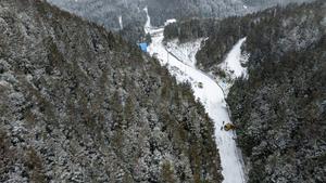 (250127) -- LIUPANSHUI, 27 enero, 2025 (Xinhua) -- Vista aérea tomada con un dron el 26 de enero de 2025 de empleados de la oficina local de suministro eléctrico de camino a un punto de control, en la ciudad de Liupanshui, en la provincia de Guizhou, en el suroeste de China. En caso de interrupción del suministro eléctrico debido a las continuas nevadas, la oficina local de suministro eléctrico llevó a cabo una inspección urgente y un trabajo de mantenimiento para garantizar el funcionamiento seguro y estable de la red eléctrica local. (Xinhua/Tao Liang) (oa) (ah) (ce)