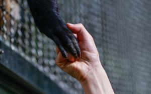 (250422) -- GUIYANG, 22 abril, 2025 (Xinhua) -- Imagen del 15 de abril de 2025 de un cuidador interactuando con un mono nariz chata de Guizhou en un centro de investigación de monos de nariz chata de Guizhou de la Reserva Natural Nacional del Monte Fanjing, en la provincia de Guizhou, en el suroeste de China. El raro mono de nariz chata de Guizhou, o mono dorado de Guizhou, ubicado exclusivamente en la extensión del Monte Fanjing, declarado Patrimonio Natural de la Humanidad por la UNESCO, se encuentra bajo protección de máximo nivel en China y está catalogado como especie "en peligro crítico" por la Unión Internacional para la Conservación de la Naturaleza. (Xinhua/Yang Wenbin) (oa) (ah) (vf)