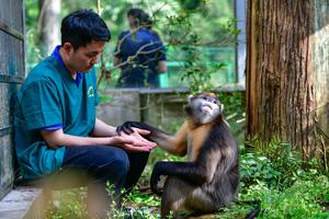 (250422) -- GUIYANG, 22 abril, 2025 (Xinhua) -- Imagen del 15 de abril de 2025 de un cuidador interactuando con un mono nariz chata de Guizhou en un centro de investigación de monos de nariz chata de Guizhou de la Reserva Natural Nacional del Monte Fanjing, en la provincia de Guizhou, en el suroeste de China. El raro mono de nariz chata de Guizhou, o mono dorado de Guizhou, ubicado exclusivamente en la extensión del Monte Fanjing, declarado Patrimonio Natural de la Humanidad por la UNESCO, se encuentra bajo protección de máximo nivel en China y está catalogado como especie "en peligro crítico" por la Unión Internacional para la Conservación de la Naturaleza. (Xinhua/Yang Wenbin) (oa) (ah) (vf)