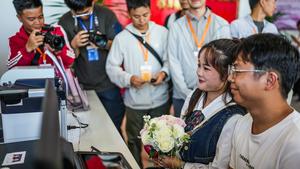 (250929) -- ZHENFENG, 29 septiembre, 2025 (Xinhua) -- Imagen del 28 de septiembre de 2025 de una pareja registrándose para casarse en una estación de servicio de registro matrimonial cerca del Puente del Gran Cañón de Huajiang, en el distrito de Zhenfeng, en la provincia de Guizhou, en el suroeste de China. El Puente sobre el Gran Cañón de Huajiang, el puente más alto del mundo abrió al tráfico la mañana del domingo, en la provincia de Guizhou, en el suroeste de China reduciendo el tiempo de viaje a través de un profundo cañón de dos horas a solo dos minutos después de tres años de construcción. (Xinhua/Tao Liang) (rtg) (ah)