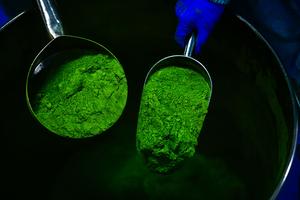 (250423) -- GUIZHOU, 23 abril, 2025 (Xinhua) -- Imagen del 14 de abril de 2025 de polvo de matcha visto en una fábrica de matcha, en el distrito de Jiangkou de Tongren, en la provincia de Guizhou, en el suroeste de China. Ubicado al pie del monte Fanjing, un sitio del Patrimonio Mundial de la UNESCO, el distrito de Jiangkou es una potencia en la industria mundial de matcha. El distrito cuenta con más de 10.000 hectáreas de plantaciones de té, casi una quinta parte de las cuales se dedica a la producción de matcha. (Xinhua/Yang Wenbin) (jg) (da) (ce)