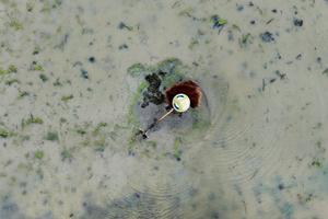 (260420) -- BEIJING, 20 abril, 2026 (Xinhua) -- Vista aérea tomada con un dron el 20 de abril de 2026 de un agricultor trabajando en un arrozal, en el poblado de Mala, en el distrito de Qianjiang, en la municipalidad de Chongqing, en el suroeste de China. El lunes se conmemora el Guyu, o Lluvia de Granos, el sexto de los 24 términos solares tradicionales chinos, lo que significa el inicio de la temporada de lluvias, un momento favorable para la siembra y el crecimiento de los cultivos. (Xinhua/Yang Min) (oa) (ah) (vf)