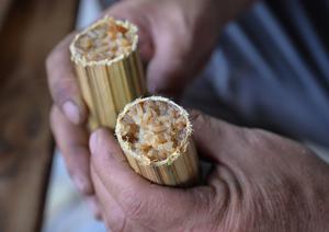 (250129) -- BAOTING, 29 enero, 2025 (Xinhua) -- Imagen del 28 de enero de 2025 de un aldeano mostrando comida de arroz glutinoso en tubos de bambús en el área turística de Binglanggu, en el distrito autónomo li y miao de Baoting, en la provincia de Hainan, en el sur de China. Un evento sobre la cultura del grupo étnico li se llevó a cabo en el área turística de Binglanggu para celebrar el Año Nuevo chino, donde los turistas pudieron vestirse con atuendos tradicionales y degustar comida con características del grupo étnico li. (Xinhua/Pu Xiaoxu) (ah) (ra) (vf)