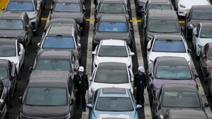 (250128) -- HAIKOU, 28 enero, 2025 (Xinhua) -- Imagen del 26 de enero de 2025 de trabajadores revisando antes de la salida de un ferry que transporta vehículos de nueva energía en el puerto de Xiuying, en la ciudad de Haikou, en la provincia de Hainan, en el sur de China. Para prepararse para la temporada alta de viajes por la Fiesta de la Primavera y gestionar mejor la afluencia de turistas y vehículos en Hainan, las autoridades han mejorado los servicios de ferry a través del estrecho de Qiongzhou y han modernizado los muelles para garantizar un transporte marítimo seguro. También se han puesto en funcionamiento ferris específicamente designados para transportar vehículos de nueva energía (VNE). Al menos 20 viajes diarios de estos ferris se han programado, lo que puede garantizar la entrada o salida de 3.500 VNE de la isla durante esta temporada alta de viajes. (Xinhua/Yang Guanyu) (jg) (ra) (vf)