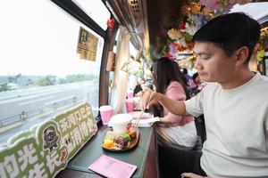 (250406) -- HAIKOU, 6 abril, 2025 (Xinhua) -- Un turista disfruta de aperitivos a bordo del autobús Laobacha Haikou de la ruta especial de la Exposición Internacional de Productos de Consumo de China (CICPE, por sus siglas en inglés), en Haikou, en la provincia de Hainan, en el sur de China, el 6 de abril de 2025. Previo a la próxima quinta CICPE, el autobús Laobacha Haikou inauguró su ruta especial CICPE. Laobacha es una querida tradición de Hainan en la que los residentes se reúnen para disfrutar de un té aromático, aperitivos salados y charlas informales. Con un techo corredizo panorámico y un escenario musical, el autobús fusiona la cultura local con innovadores diseños inspirados en la exposición y conecta los lugares turísticos más populares de la ciudad, mostrando el encanto del turismo local. (Xinhua/Zhang Liyun) (rtg) (da)