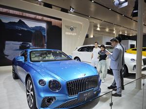 (250416) -- HAIKOU, 16 abril, 2025 (Xinhua) -- Imagen del 15 de abril de 2025 de visitantes observando un automóvil Bentley en la V Exposición Internacional de Productos de Consumo de China (CICPE, por sus siglas en inglés), en Haikou, en la provincia de Hainan, en el sur de China. En el área de exhibición de estilo de vida de moda de la exposición de consumo en curso, seis marcas de Volkswagen Group de China, incluidas Volkswagen, Audi, Porsche y Bentley, mostraron los últimos avances en lujo y movilidad eléctrica. (Xinhua/Zhou Huimin) (ah) (ra) (vf)