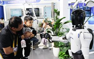 (250414) -- HAIKOU, 14 abril, 2025 (Xinhua) -- Un niño interactúa con un robot en la V Exposición Internacional de Productos de Consumo de China (CICPE, por sus siglas en inglés), en Haikou, en la provincia de Hainan, en el sur de China, el 14 de abril de 2025. La exposición de este año destaca la tecnología futurista a través del debut de diversos robots innovadores. Al presentar funcionalidades impulsadas por Inteligencia Artificial y aplicaciones de mundo real, estos robots ofrecen un vistazo al futuro de la vida cotidiana. (Xinhua/Yang Guanyu) (rtg) (ah) (vf)