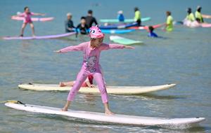 (250810) -- SANYA, 10 agosto, 2025 (Xinhua) -- Una niña practica surf en una playa, en la ciudad de Sanya, en la provincia de Hainan, en el sur de China, el 10 de agosto de 2025. Los turistas acuden en masa a Sanya para disfrutar del surf durante las vacaciones de verano. (Xinhua/Guo Cheng) (oa) (da)