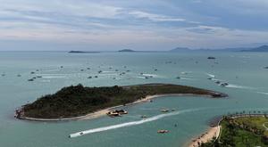 (250827) -- SANYA, 27 agosto, 2025 (Xinhua) -- Vista aérea tomada con un dron el 27 de agosto de 2025 de turistas realizando un viaje en yate para hacer turismo, en Sanya, en la provincia de Hainan, en el sur de China. Tras el paso del tifón Kajiki, la ciudad de Sanya ha actuado con rapidez para restablecer su mercado turístico. (Xinhua/Zhao Yingquan) (jg) (da) (ce)