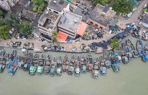 (250816) -- HAIKOU, 16 agosto, 2025 (Xinhua) -- Vista aérea tomada con un dron el 16 de agosto de 2025 de buques pesqueros temporalmente retrasados en su salida debido a una depresión tropical, en un puerto, en Haikou, en la provincia de Hainan, en el sur de China. Para garantizar la seguridad en medio de una depresión tropical en curso, el Departamento Provincial de Agricultura y Asuntos Rurales de Hainan emitió un aviso instando a los pescadores a suspender temporalmente las actividades pesqueras y a mantener sus barcos resguardados de forma segura en el puerto. (Xinhua/Pu Xiaoxu) (oa) (ra) (ce)
