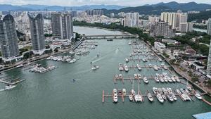 (250823) -- SANYA, 23 agosto, 2025 (Xinhua) -- Vista aérea del 23 de agosto de 2025 de yates en un muelle, en Sanya, en la provincia de Hainan, en el sur de China. China activó el sábado una respuesta de emergencia de nivel IV por posibles inundaciones e impacto de tifón en la provincia de Hainan, ante la cercanía de Kajiki, el decimotercer tifón de este año, informó el Ministerio de Gestión de Emergencias. (Xinhua/Zhao Yingquan) (jg) (da)