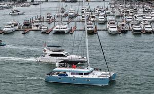 (250823) -- SANYA, 23 agosto, 2025 (Xinhua) -- Vista aérea tomada con un dron el 23 de agosto de 2025 de yates regresando a un muelle, en Sanya, en la provincia de Hainan, en el sur de China. China activó el sábado una respuesta de emergencia de nivel IV por posibles inundaciones e impacto de tifón en la provincia de Hainan, ante la cercanía de Kajiki, el decimotercer tifón de este año, informó el Ministerio de Gestión de Emergencias. (Xinhua/Zhao Yingquan) (jg) (da)