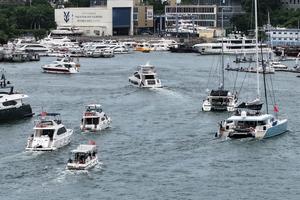 (250823) -- SANYA, 23 agosto, 2025 (Xinhua) -- Vista aérea tomada con un dron el 23 de agosto de 2025 de yates regresando a un muelle, en Sanya, en la provincia de Hainan, en el sur de China. China activó el sábado una respuesta de emergencia de nivel IV por posibles inundaciones e impacto de tifón en la provincia de Hainan, ante la cercanía de Kajiki, el decimotercer tifón de este año, informó el Ministerio de Gestión de Emergencias. (Xinhua/Zhao Yingquan) (jg) (da)