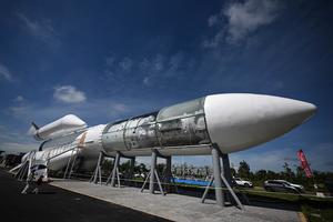 (251007) -- WENCHANG, 7 octubre, 2025 (Xinhua) -- Imagen del 7 de octubre de 2025 de un modelo del cohete portador Gran Marcha-5B exhibido en el Centro de Ciencia y Educación Aeroespacial de Wenchang, en Wenchang, en la provincia de Hainan, en el sur de China. En preparación para su inauguración oficial, el centro está abierto al público de forma gratuita por tiempo limitado, lo que permite a los visitantes experimentar su funcionamiento y servicios de primera mano. (Xinhua/Pu Xiaoxu) (oa) (ah) (vf)