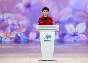 (250207) -- HARBIN, 7 febrero, 2025 (Xinhua) -- Liang Huiling, presidenta del Comité Organizador de los IX Juegos Asiáticos de Invierno de Harbin, y gobernadora de la provincia de Heilongjiang, habla durante la ceremonia de apertura de los IX Juegos Asiáticos de Invierno, en Harbin, en la provincia de Heilongjiang, en el noreste de China, el 7 de febrero de 2025. (Xinhua/Xie Jianfei) (rtg) (ra) (vf)