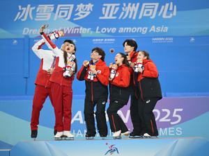 (250212) — HARBIN, 12 febrero, 2025 (Xinhua) — Los medallistas de oro, Yoshida Utana/Morita Masaya, de Japón, los medallistas de plata, Ren Junfei/Xing Jianing, de China, y los medallistas de bronce, Tanaka Azusa/Nishiyama Shingo, de Japón, posan para una fotografía en la ceremonia de premiación de danza sobre hielo del evento de patinaje artístico en los IX Juegos Asiáticos de Invierno, en Harbin, en la provincia de Heilongjiang, en el noreste de China, el 12 de febrero de 2025. (Xinhua/Yan Linyun) (ah) (ra) (vf)