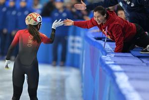 (250209) -- HARBIN, 9 febrero, 2025 (Xinhua) -- Gong Li (i), de China, festeja con su entrenadora, Zhang Jing, al término de la prueba final de relevo 3000m femeninos del evento de patinaje de velocidad en pista corta en los IX Juegos Asiáticos de Invierno, en Harbin, en la provincia de Heilongjiang, en el noreste de China, el 9 de febrero de 2025. (Xinhua/Jiang Han) (oa) (rtg) (ah)