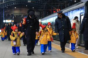 (251231) — HARBIN, 31 diciembre, 2025 (Xinhua) — Imagen del 30 de diciembre de 2025 de trabajadores del tren K7041 guiando a niños de Guangxi para que aborden el tren en la Estación del Ferrocarril de Harbin, en Harbin, en la provincia de Heilongjiang, en el noreste de China. Un total de 18 niños de la región autónoma de la etnia zhuang de Guangxi, en el sur de China, abordaron el martes el tren K7041 desde Harbin a la ciudad de Mohe para realizar un viaje de estudios. La tripulación del tren decoró el tren con pegatinas en las ventanas, y otras características distintivas en el vagón restaurante, y organizó actividades interactivas, como elaboración de dumplings para enriquecer la experiencia de viaje de los niños. (Xinhua/Xu Shuai) (ah) (ra) (vf)