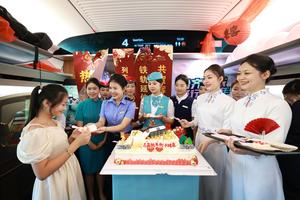 (250817) -- HARBIN, 17 agosto, 2025 (Xinhua) -- Miembros de la tripulación de un ferrocarril entregan un pedazo de pastel a una niña para celebrar el décimo aniversario de la puesta en funcionamiento del ferrocarril Harbin-Qiqihar en un tren, en la provincia de Heilongjiang, en el noreste de China, el 17 de agosto de 2025. El 17 de agosto de 2015, la vía de ferrocarril Harbin-Qiqiha, el primer ferrocarril de alta velocidad de Heilongjiang, desde la capital provincial de Harbin hacia la ciudad de Qiqihar, y se convirtió en el ferrocarril de su tipo más septentrional de China en operación en la provincia nororiental de China. El ferrocarril Harbin-Qiqihar conmemora su décimo aniversario de funcionamiento el domingo. En la última década, los trenes bala han recorrido de forma segura más de 81,89 millones de kilómetros y han transportado a más de 100 millones de pasajeros. (Xinhua/Xu Shuai) (rtg) (ah)