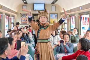 (251228) — HARBIN, 28 diciembre, 2025 (Xinhua) — Turistas observan una presentación a bordo de un tren turístico, en la provincia de Heilongjiang, en el noreste de China, el 28 de diciembre de 2025. El tren Y999/998, un tren turístico con temática de hielo y nieve, inició un viaje de seis días el domingo. (Xinhua/Yuan Yong) (ah) (oa) (da)