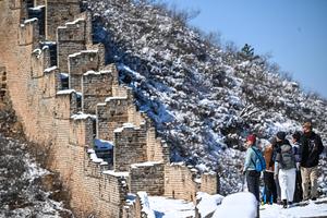 (250316) -- LUANPING, 16 marzo, 2025 (Xinhua) -- Turistas visitan la sección de Jinshanling de la Gran Muralla cubierta por nieve, en el distrito de Luanping de Chengde, en la provincia de Hebei, en el norte de China, el 16 de marzo de 2025. (Xinhua/Chen Yehua) (rtg) (ah)