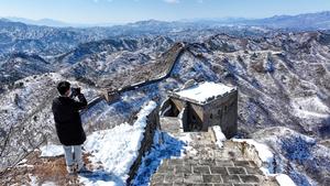 (250316) -- LUANPING, 16 marzo, 2025 (Xinhua) -- Imagen tomada con un dron el 16 de marzo de 2025 de un turista fotografiando el paisaje nevado en la sección de Jinshanling de la Gran Muralla cubierta por nieve, en el distrito de Luanping de Chengde, en la provincia de Hebei, en el norte de China. (Xinhua/Chen Yehua) (rtg) (ah)