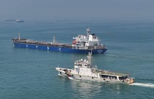 (250719) — TANGSHAN, 19 julio, 2025 (Xinhua) — Imagen tomada con un dron el 18 de julio de 2025 de un buque patrullero (frente) escoltando la salida de un carguero en aguas de la Zona Portuaria de Caofeidian en el puerto de Tangshan, en Tangshan, en la provincia de Hebei, en el norte de China. El rendimiento de carga en el puerto de Tangshan alcanzó los 433,56 millones de toneladas en el primer semestre de 2025, lo que supone un aumento interanual del 0,75 por ciento, según las autoridades portuarias. (Xinhua/Yang Shiyao) (oa) (da)