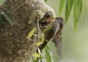 (250625) -- TANGSHAN, 25 junio, 2025 (Xinhua) -- Imagen del 24 de junio de 2025 de un pájaro moscón chino (Remiz consobrinus) alimentando a un polluelo en su nido en un humedal, en el distrito de Fengnan de Tangshan, en la provincia de Hebei, en el norte de China. (Xinhua/Yang Shiyao) (jg) (da) (vf)