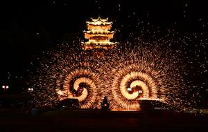 (250829) — HEFEI, 29 agosto, 2025 (Xinhua) — Imagen del 27 de agosto de 2025 de un espectáculo de fuegos artificiales de hierro fundido presentado en el distrito de Xiuning de la ciudad de Huangshan, en la provincia de Anhui, en el este de China. El mercado del turismo cultural de verano está en auge en la provincia de Anhui, donde el patrimonio cultural inmaterial se ha convertido en un importante atractivo para los visitantes. (Xinhua/Zhou Mu) (rtg) (ra) (ce)