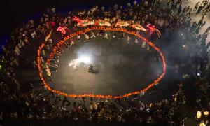 (250829) -- HEFEI, 29 agosto, 2025 (Xinhua) -- Vista aérea tomada con un dron el 23 de agosto de 2025 de una presentación de la danza del dragón con bancos de madera, en la aldea de Xidi del distrito de Yixian, en la ciudad de Huangshan, en la provincia de Anhui, en el este de China. El mercado del turismo cultural de verano está en auge en la provincia de Anhui, donde el patrimonio cultural inmaterial se ha convertido en un importante atractivo para los visitantes. (Xinhua/Wang Cheng) (rtg) (ra) (ce)