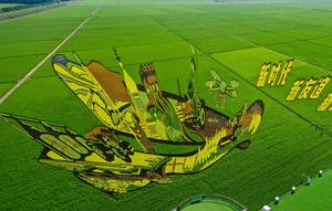 (250705) — SHUANGYASHA, 5 julio, 2025 (Xinhua) — Vista aérea tomada con un dron el 4 de julio de 2025 de campos de arroz del Grupo Beidahuang, en la ciudad de Shuangyashan, en la provincia de Heilongjiang, en el noreste de China. En la actualidad, en las áreas productoras de arroz de la provincia de Heilongjiang, diversas imágenes magníficas de campos de arroz «dibujadas» por diferentes variedades de arroz se despliegan sobre la vasta tierra negra. (Xinhua/Xu Hongyu) (oa) (da)